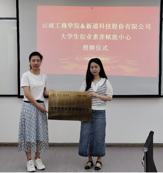 与此同时,为进一步深化我院创新创业教育改革和推进创新创业教育质量发展,提升师资队伍的教学力量,全面推进创新创业教育高质量教学,打造我院创新创业高质量特色课程。云南工商学院联合新道科技股份有限公司打造大学生创业素养赋能中心,并在培训之前进行授牌。