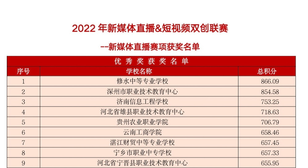 2022年04月01日-2022年06月30日,为期两个月的新媒体直播、短视频双创联赛圆满落幕,该比赛由中国通信工业协会通信和信息技术创新人才培养工程项目办公室主办,全国共有101个学校参赛,云南工商学院在本次新媒体直播赛道的比赛中荣获优秀奖第6名,于此同时感谢昆明阿表哥商贸有限公司的支持。