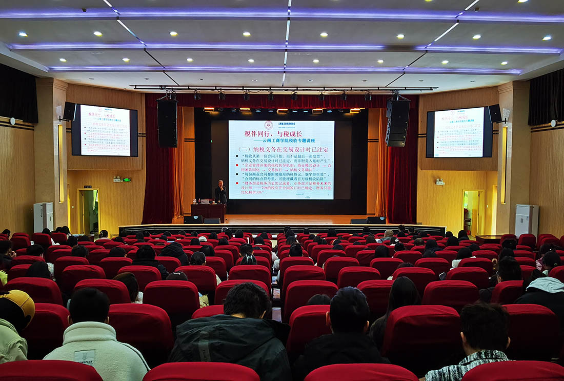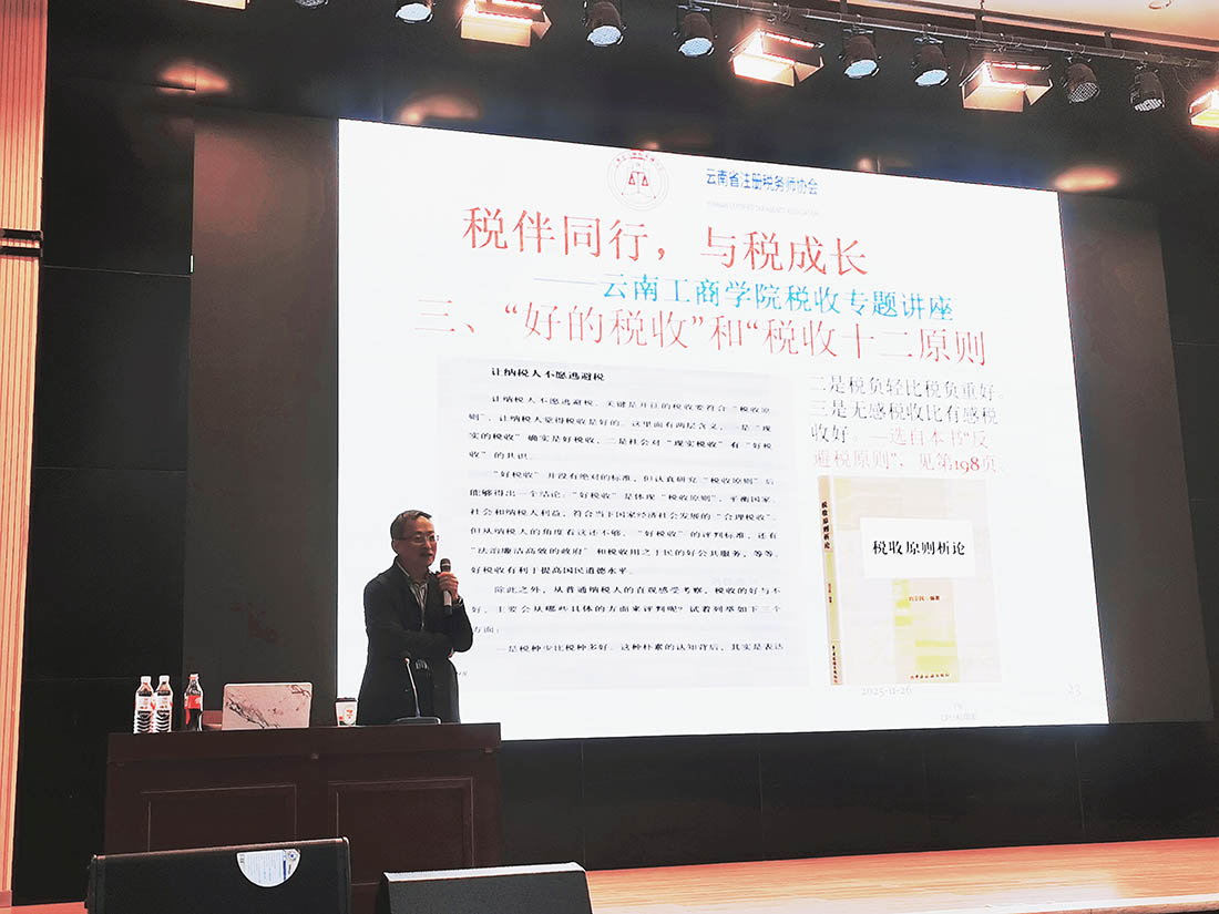 为帮助师生全面理解税收政策,深化对税收与经济社会发展关系的认知,培养涉税合规意识与专业素养,2025年11月26日,云南工商学院经济与管理学院特邀云南省注册税务师协会会长、行业党委常务副书记刘卫民先生,开展了以“税伴同行,与税成长”为主题的税收专题讲座。全院师生代表齐聚一堂,共同探寻税收的本质与价值。