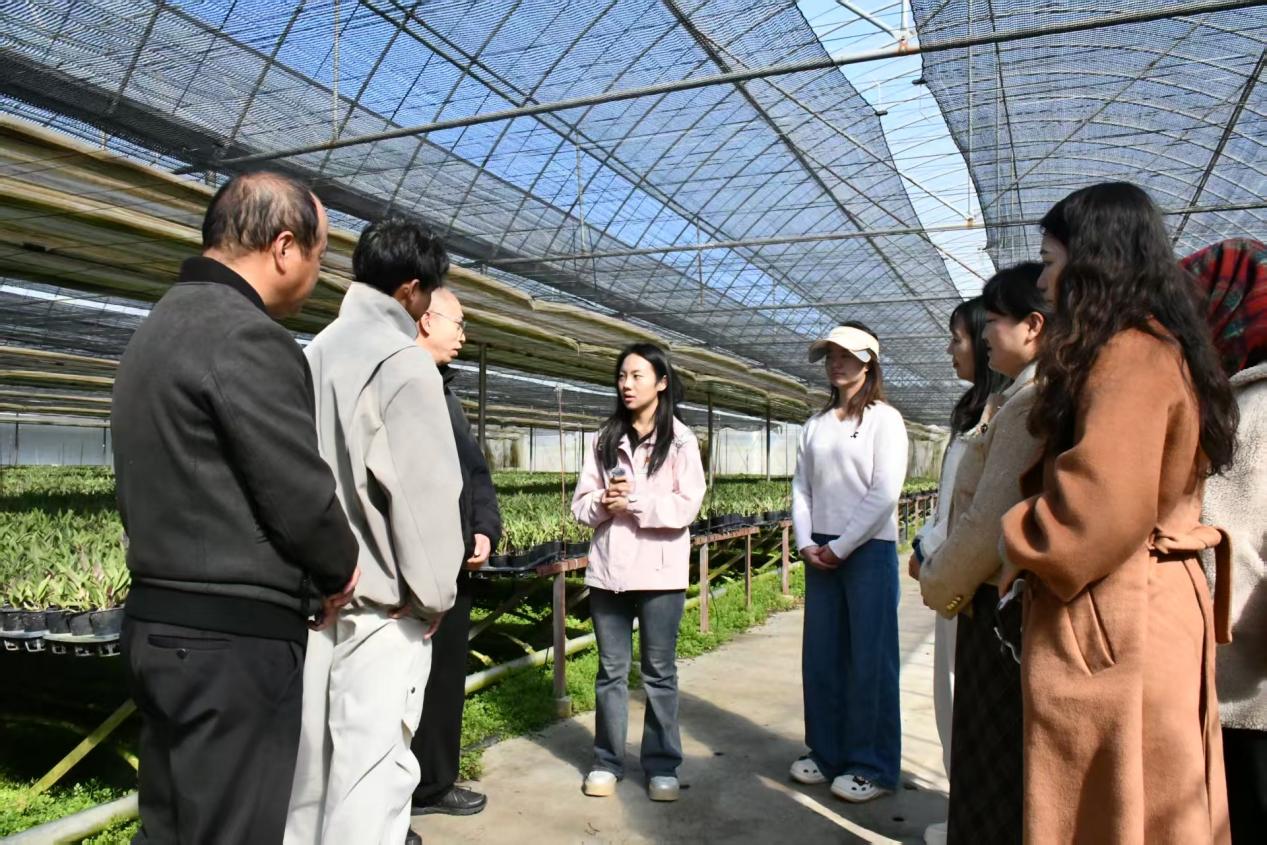 在园区企业服务局局长的带领下,师生团队先后走进多家特色基地,沉浸式感受亚洲最大高端花卉生产基地的硬核产业实力。从昆明虹之华园艺形态各异的精品菊花种苗,到花型灵动、自带飘逸感的文心兰;从需历经3 年精心培育才得以绽放、花姿雍容华贵的高端大花蕙兰(堪称 “年宵花珍品”),到花瓣萦绕天然清雅香气、养护得当可连年开花的珍贵澳洲香水石斛;再到融入 “药食同源” 理念、兼具实用与养生价值的特色中药皂产品线 —— 园区稀缺优质的花卉品类、丰富多元的产业布局,让师生们不时驻足惊叹、眼前一亮。而依托园区与云南省农科院药植所的深度合作,这些产品不仅在品质上有专业技术背书,更在稀缺性与创新性上独具优势,为后续直播推广储备了极具市场竞争力的核心素材。