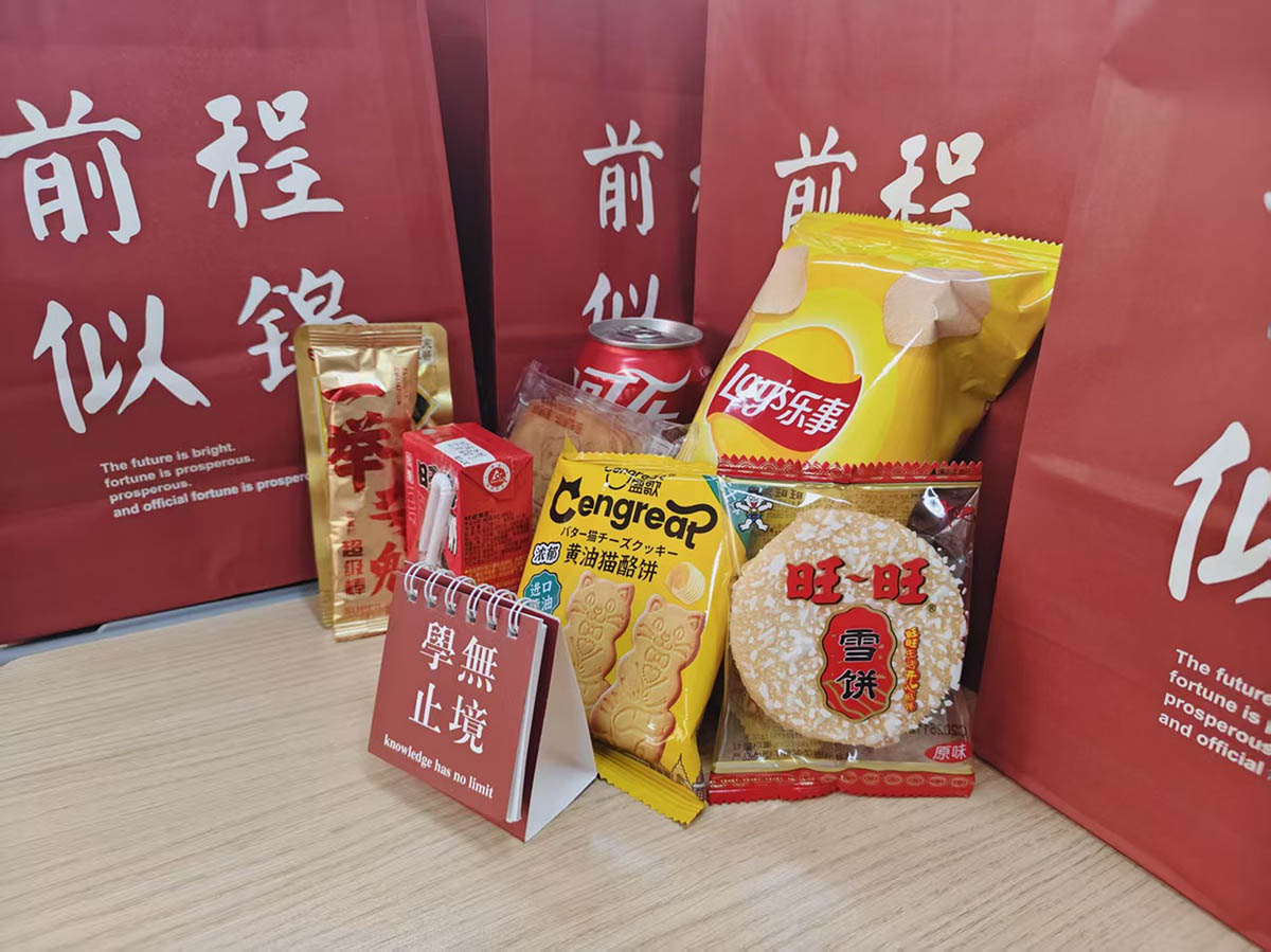 慰问活动中,最令同学们感到惊喜和温暖的,是学院精心准备的一份份寓意深长、别具匠心的小礼物。一份“旺旺”雪饼,寄托着对同学们考试运势旺盛、精神旺健的祝愿;一份象征着“一举夺魁”的棒棒糖,蕴含着金榜题名、独占鳌头的美好期许;一包“乐事”薯片,寓意备考过程虽艰辛,但更要快乐面对,享受奋斗的乐趣;一瓶“可口可乐”,则希望同学们保持乐观开朗的心境,笑对挑战;一份精巧的小日历,提醒着同学们珍惜每一天,好好利用时间。这些看似平常的小食品和饮料,被赋予了不平凡的情感与祝福,瞬间拉近了师生距离,欢声笑语中,备考的紧张情绪得到了有效缓解。